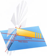 In assenza del centro del quadrante anche le linee orarie possono essere tracciate valutando il punto D dove la linea oraria intercetta la linea equinoziale calcolando la distanza d dal punto E che è l’intersezione fra sustilare ed equinoziale. Conoscendo la direzione ed il punto in cui passa è quindi possibile tracciare la linea oraria.